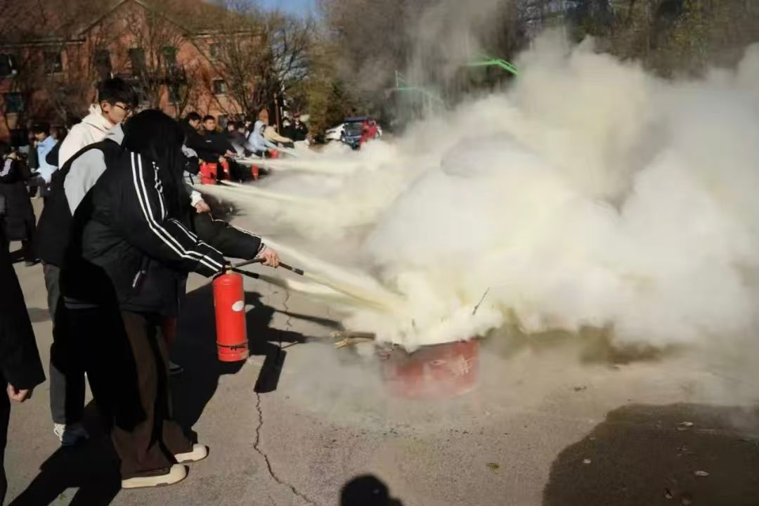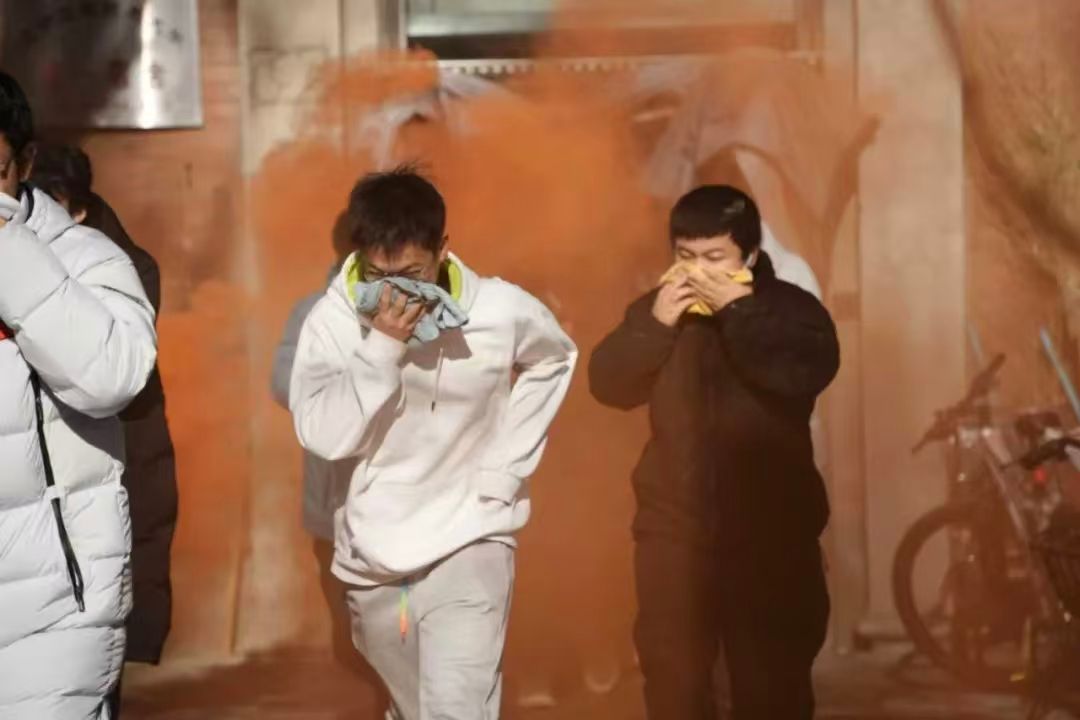 在消防安全培训环节,王亮围绕火灾预防、消防器材使用及火场逃生技巧等内容进行了详细的讲解。安全疏散模拟演练环节中,参演师生用湿毛巾捂住口鼻,俯身沿预定路线迅速、有序撤离至指定集合点;在初起火灾扑灭演练中,师生现场操作灭火器,巩固了所学消防技能。