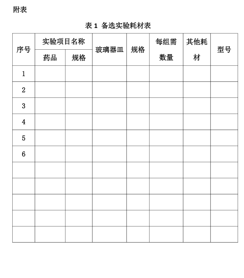 备选实验耗材表